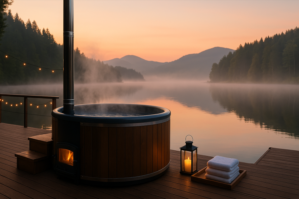 Поставте поруч чан на дровах або карпатський на дровах. Увечері пара і світло полін забезпечують «вау»-ефект, а купіль дає тишу і стабільну температуру.